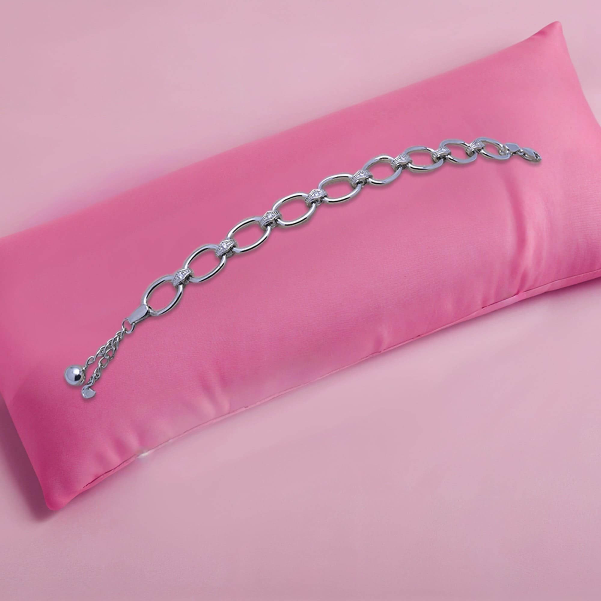 Set against a soft pink cushion, this bracelet embodies a blend of elegance and strength. Whether you're dressing up for a night out or adding a touch of shine to your daily look, this versatile silver bracelet brings it all together.