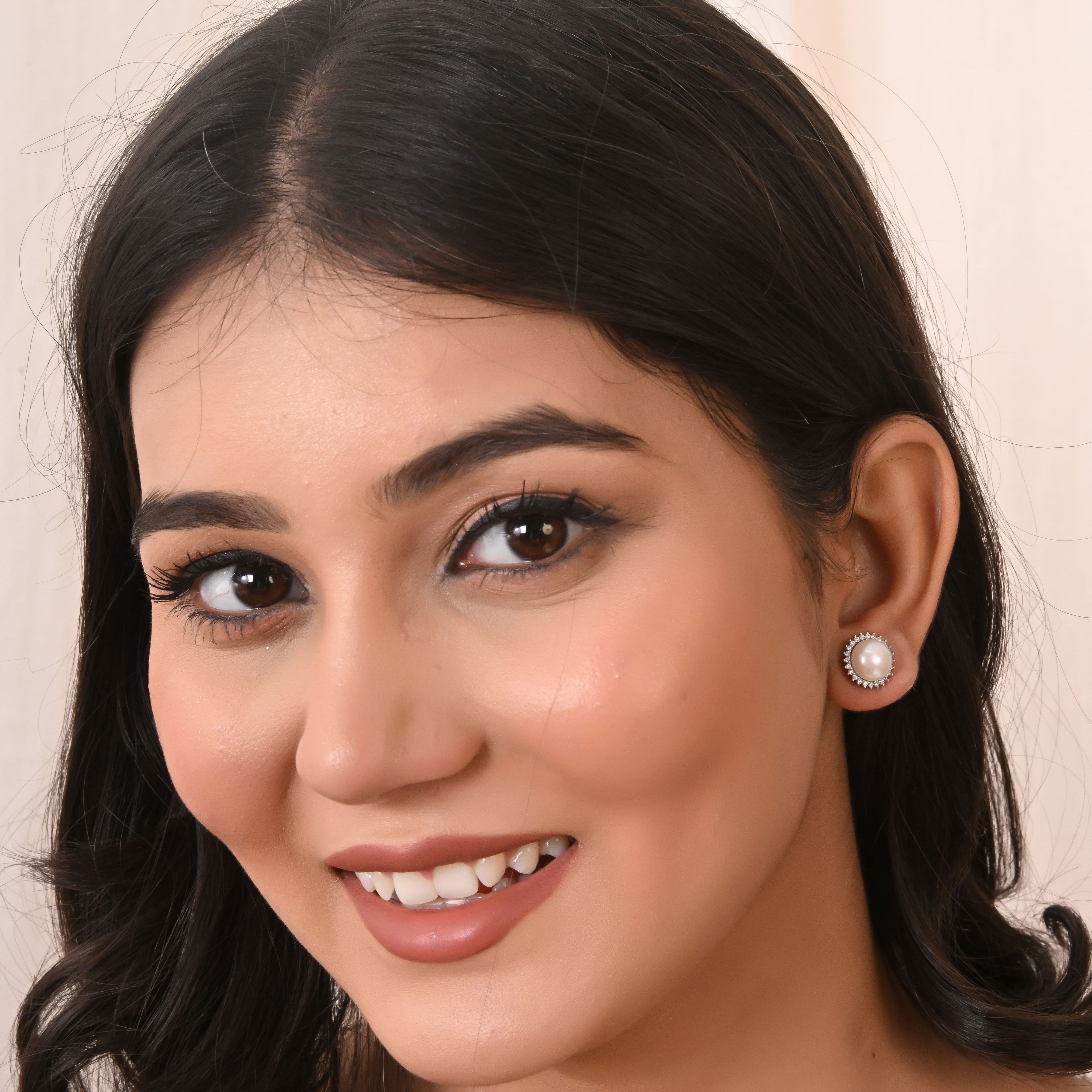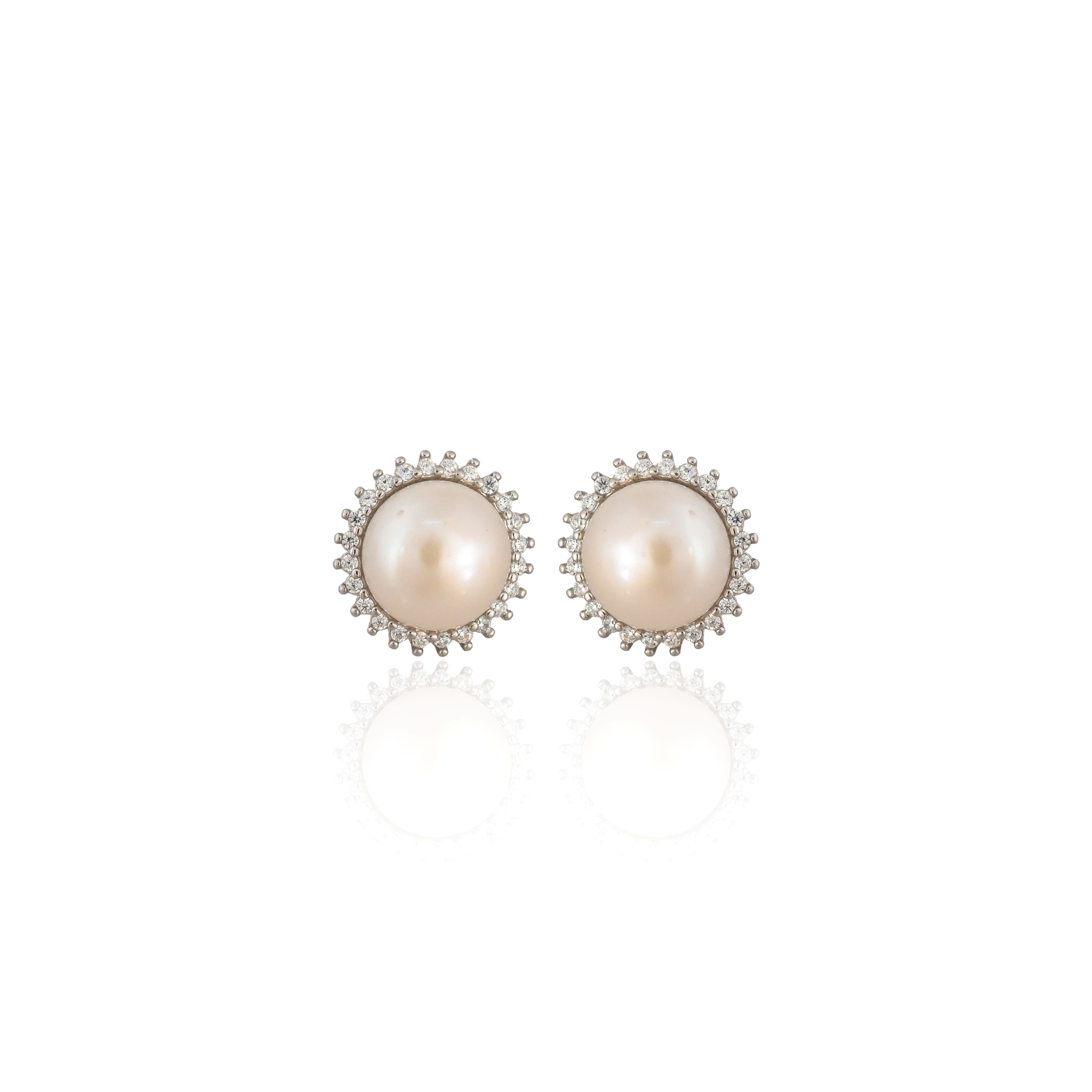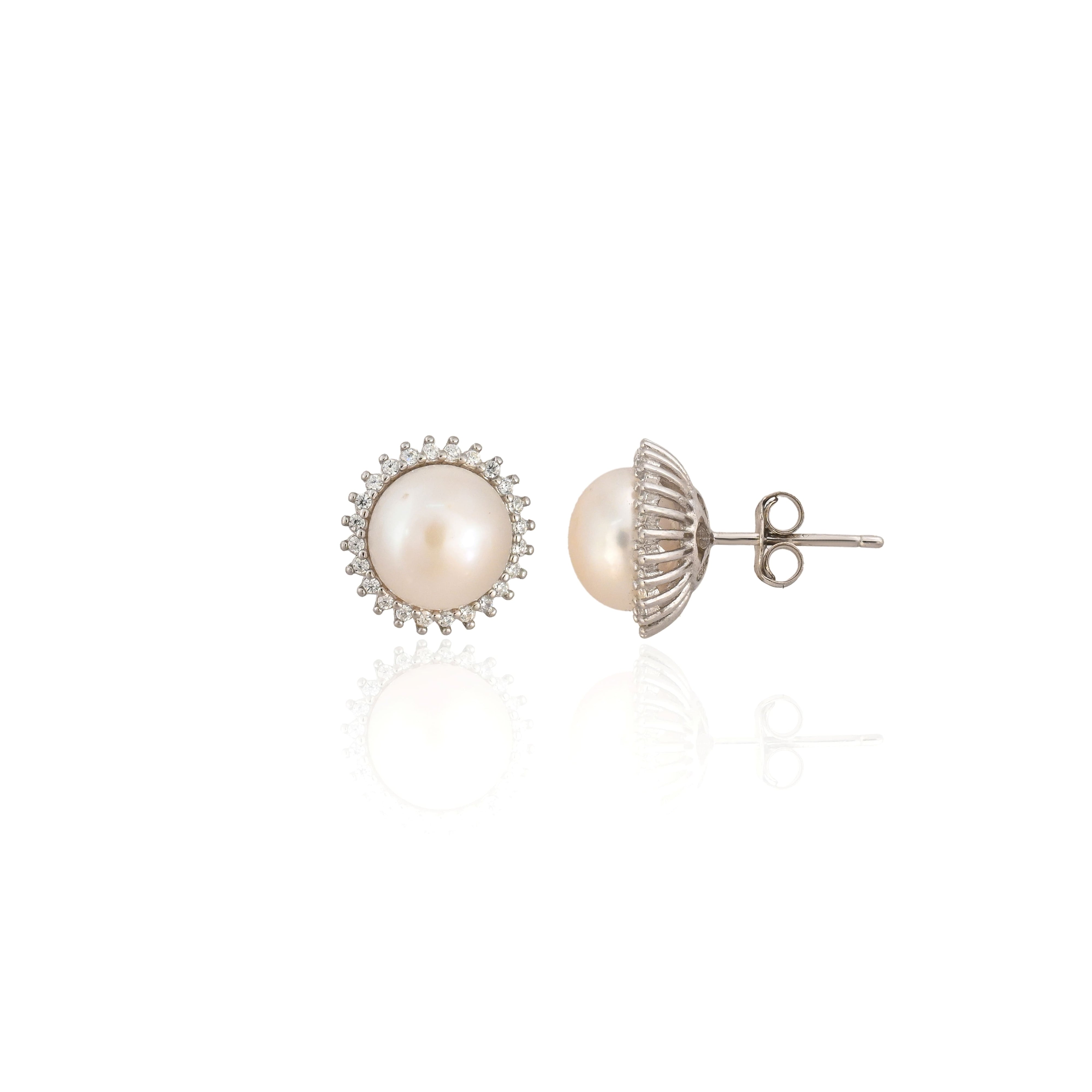Add timeless elegance to your jewelry collection with these stunning Pearl & Cubic Zirconia Halo Stud Earrings. Designed in a classic halo setting, each earring features a lustrous, high-quality pearl at the center, radiating soft, natural beauty. The pearl is encircled by a shimmering ring of precisely cut cubic zirconia stones that catch the light with every movement, adding a touch of brilliance and sophistication.