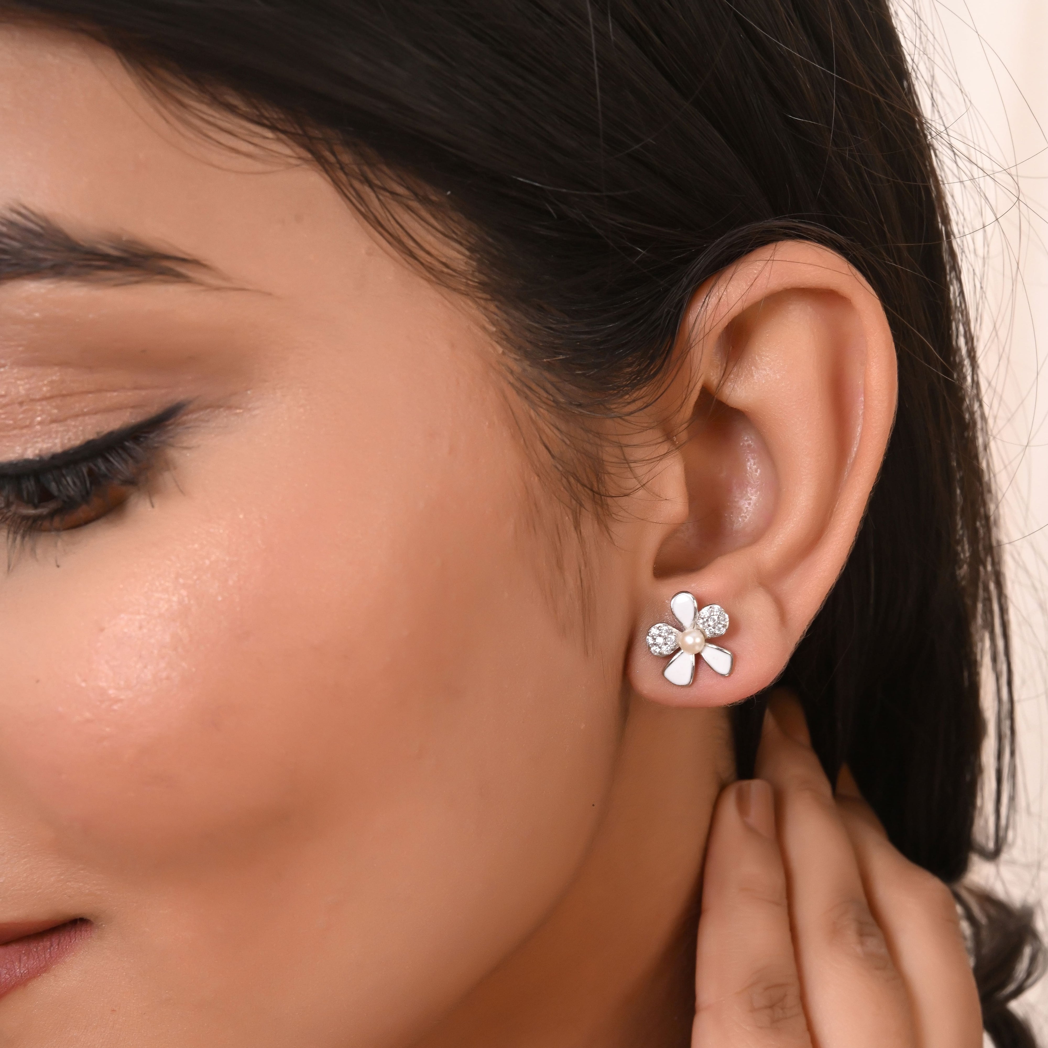 Each earring features a beautiful five-petal flower design, where three smooth silver petals are accented with lustrous pearls, and the remaining two petals shimmer with round-cut cubic zirconia, offering the perfect balance of soft luster and dazzling sparkle. At the center of the flower rests a single pearl, tying the design together with timeless grace.