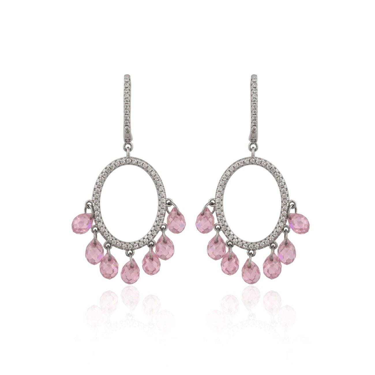 The sleek oval frame is encrusted with brilliant white cubic zirconia stones, offering a refined shimmer that catches the light just right. Dangling delicately from the frame are pink teardrop-shaped CZ stones that add a playful pop of color and undeniable charm.