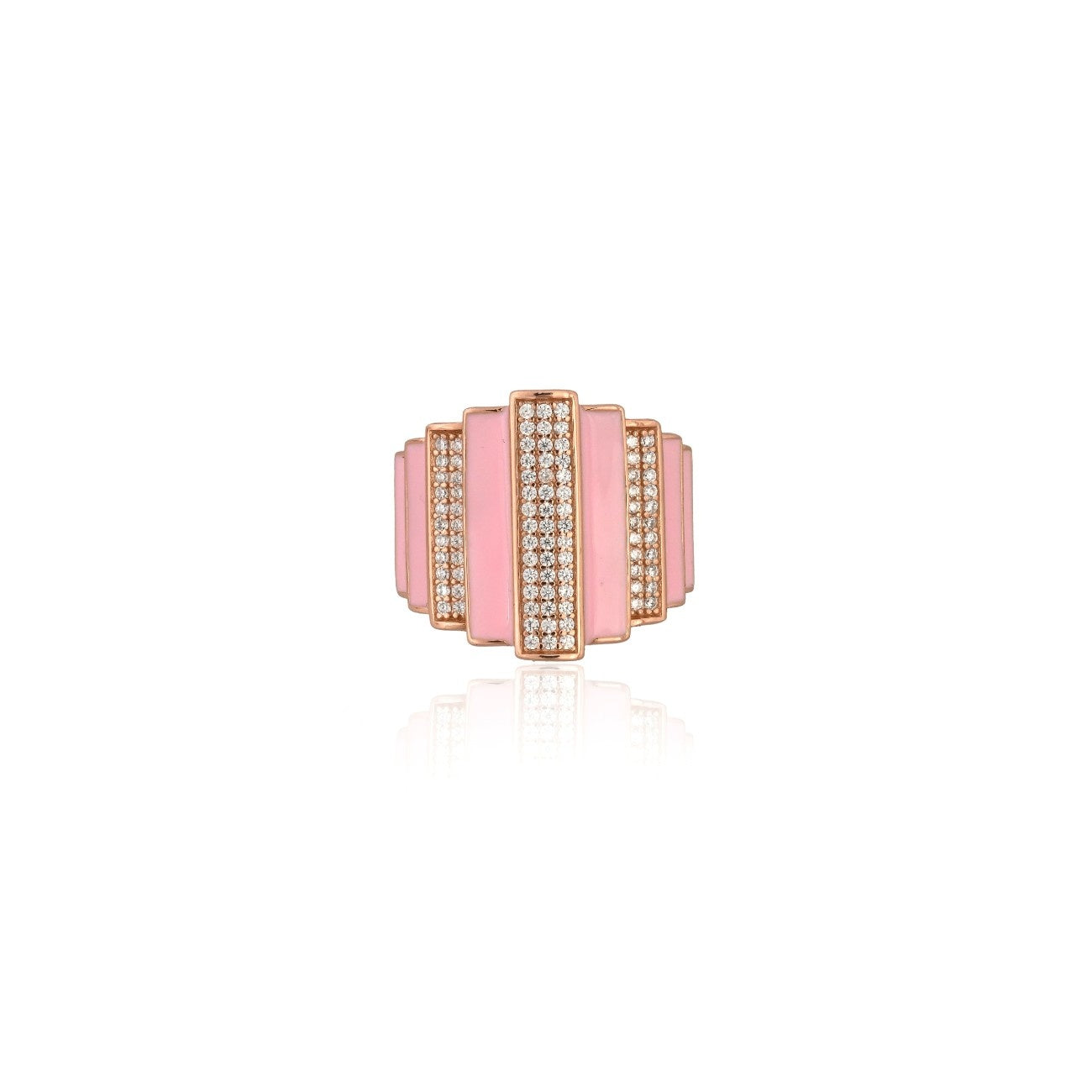 Step into the spotlight with this captivating pink enamel statement ring, a fusion of bold design and timeless elegance. Crafted in 925 silver and finished with a warm rose gold plating, this ring is accented with shimmering rows of Cubic Zirconia—a gemstone known not just for its brilliance, but also for its calming energy and symbolic connection to emotional clarity and confidence.