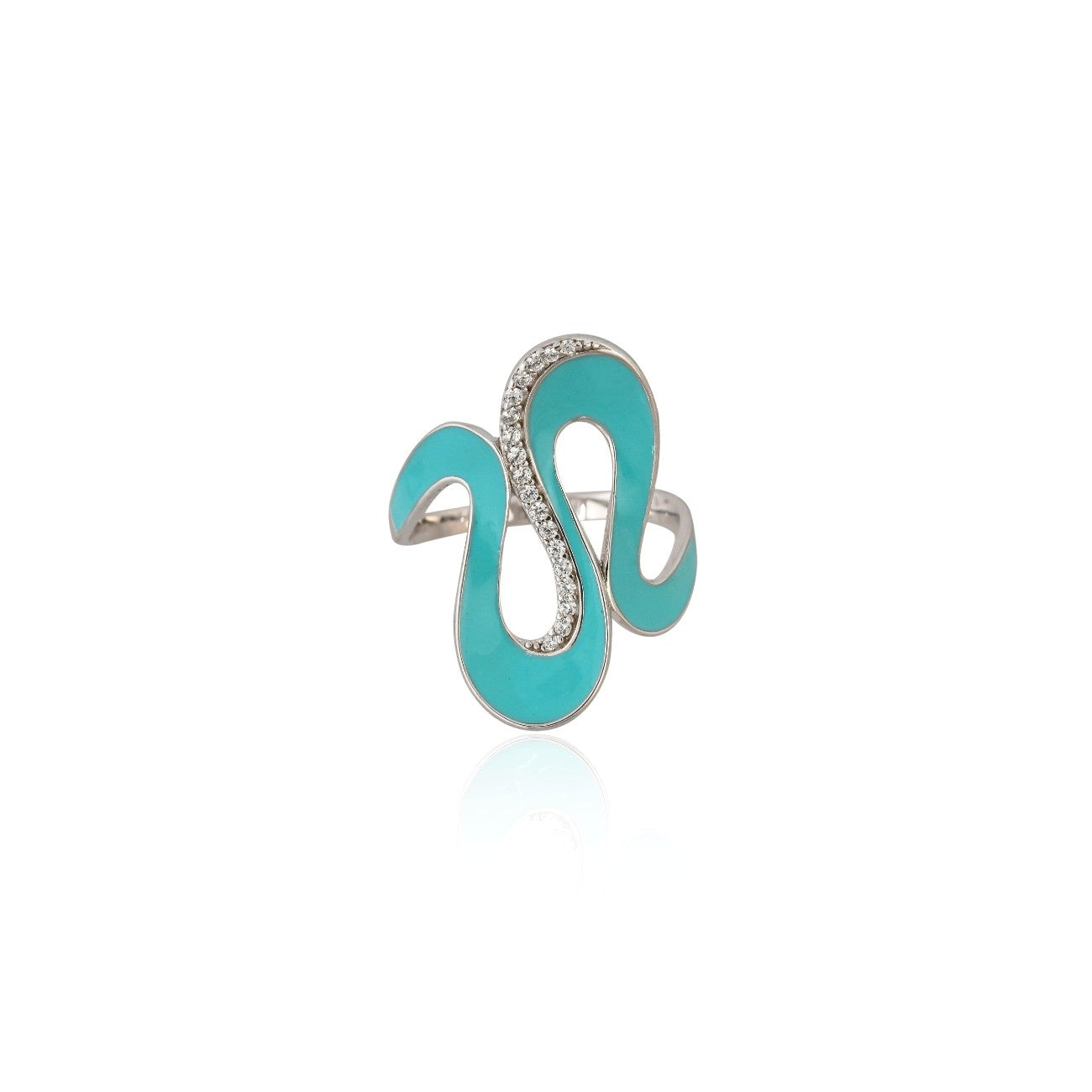 Infused with artistic elegance and modern charm, this silver ring features a striking freeform wave design enhanced by a smooth turquoise enamel finish and a line of sparkling Cubic Zirconia stones. Its fluid silhouette draws the eye with graceful movement, while the vibrant enamel adds a refreshing pop of color—perfect for those who love jewelry with a contemporary edge.